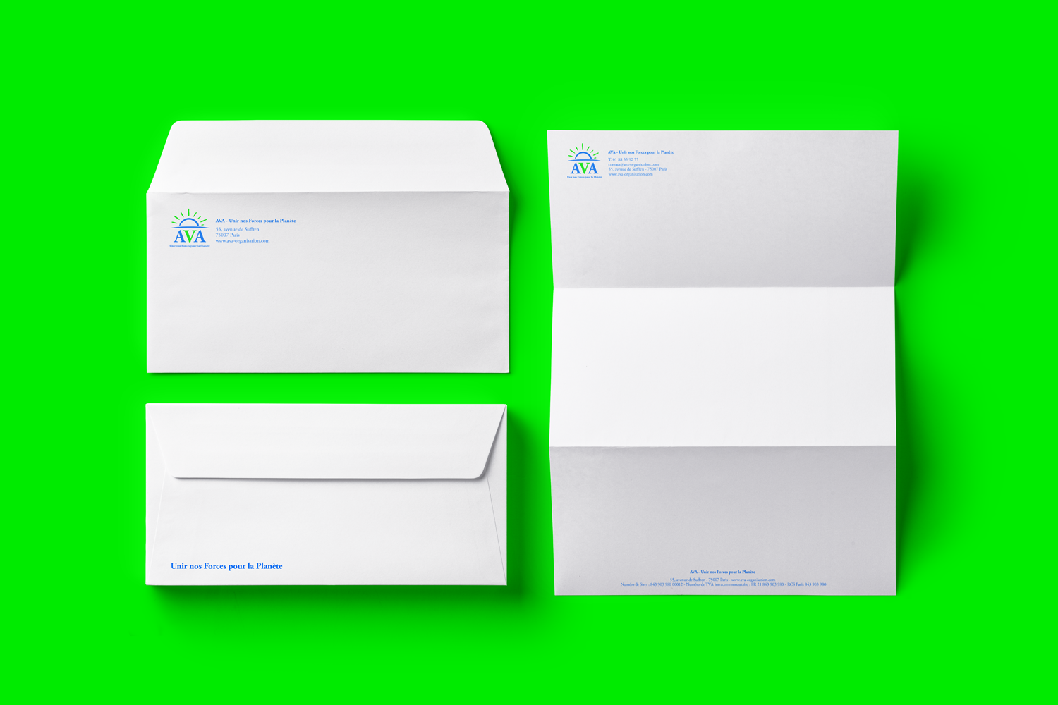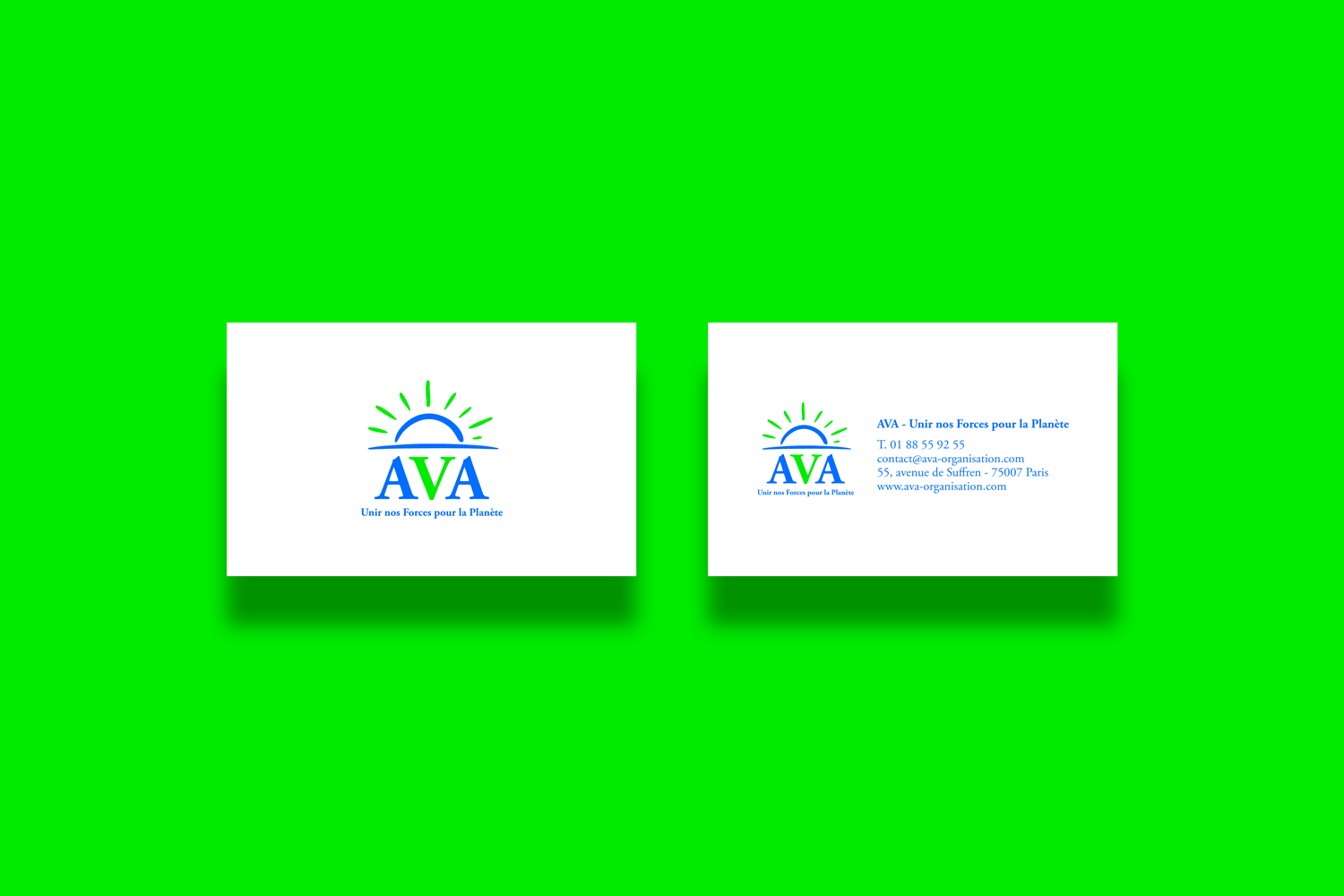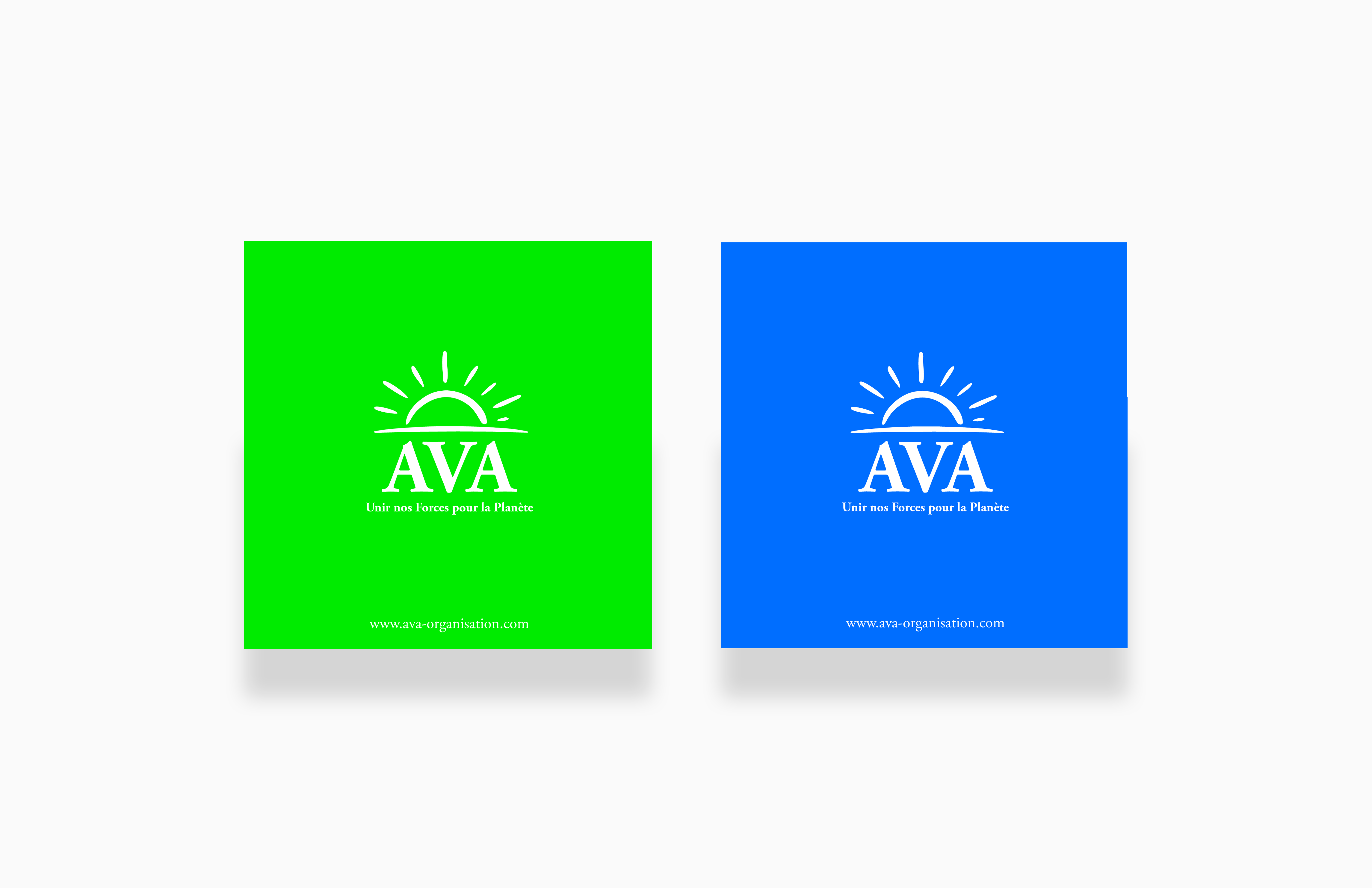 Création d'une identité visuelle contemporaine pour AVA, traduisant les enjeux climatiques et la protection du vivant grâce à des codes couleurs graphiques dynamiques et lumineux.