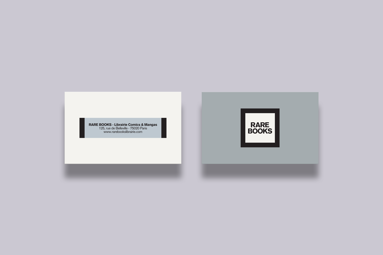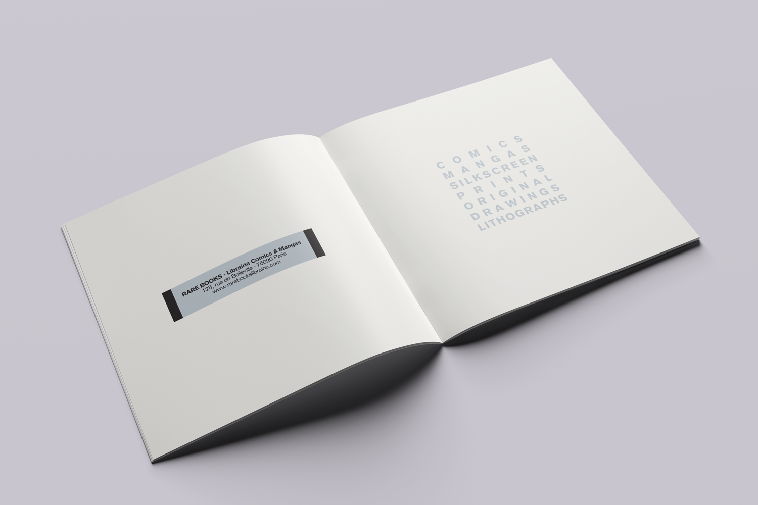 Rare Books est une librairie essentiellement spécialisée en comics, mangas et lithographies, sérigraphies et livres à tirage numéroté. Notre but était de créer une identité visuelle complète où dynamisme et accessibilité pouvaient être réunis.